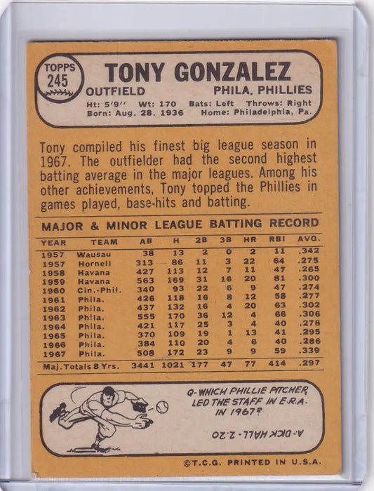 1968 Topps Baseball #245 Tony Gonzalez - Philadelphia Phillies