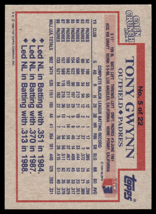 1989 Topps Cap'n Crunch #5 Tony Gwynn NM/MT San Diego Padres Baseball Card