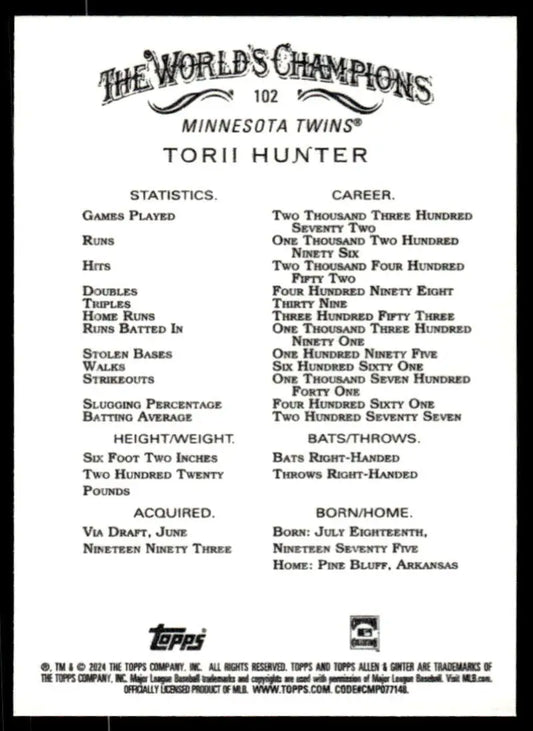 2024 Allen & Ginter #102 Torii Hunter NM-MT Minnesota Twins Baseball Card