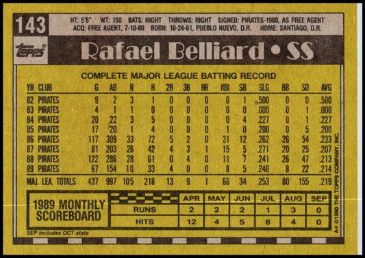 1990 Topps #143 Rafael Belliard NM-MT Pittsburgh Pirates Baseball Card