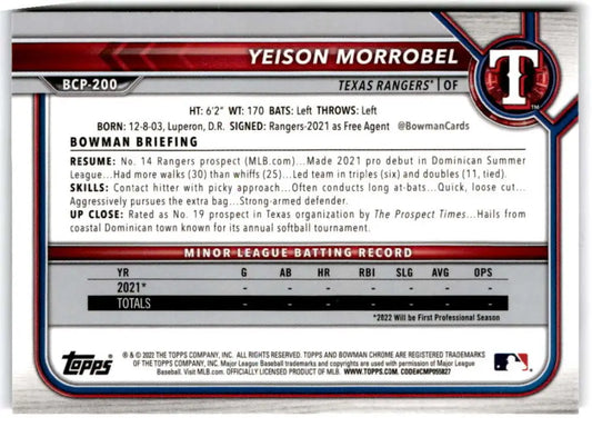 2022 Bowman Chrome Prospects #BCP-200 Yeison Morrobel NM-MT Texas Rangers Baseball Card