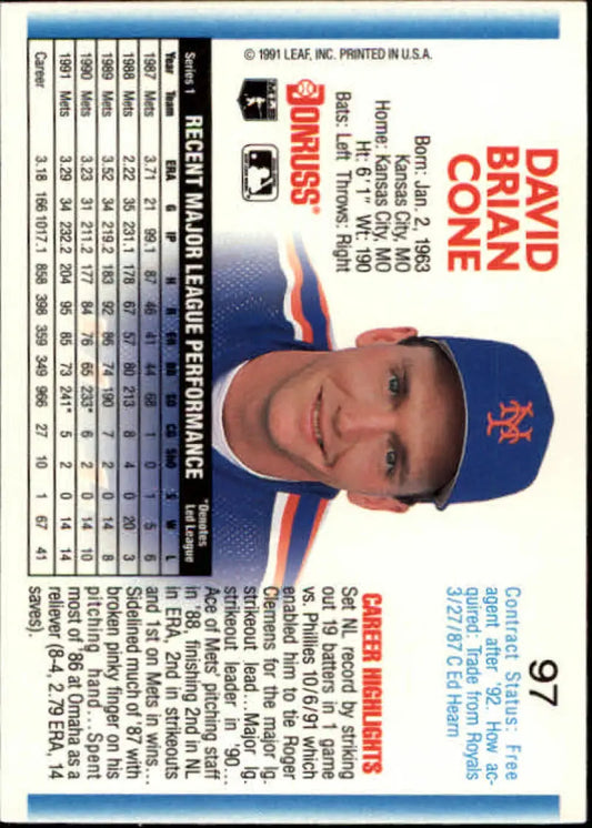 1992 Donruss #97 David Cone NM-MT New York Mets Baseball Card