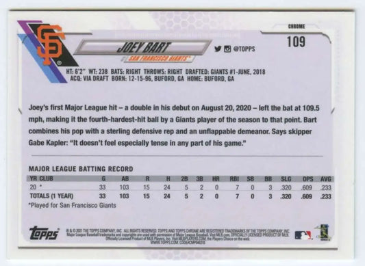 2021 Topps Chrome #109 Joey Bart NM-MT RC Rookie San Francisco Giants Baseball Card