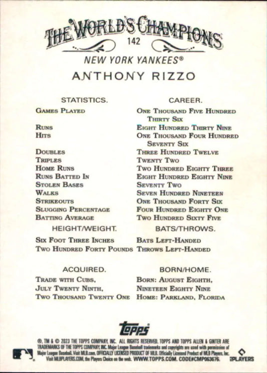 2023 Topps Allen and Ginter #142 Anthony Rizzo NM-MT New York Yankees Baseball Card