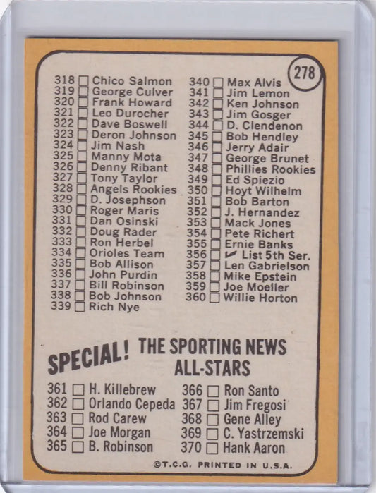 1968 Topps Baseball #278 4th Series Checklist (#284-370)