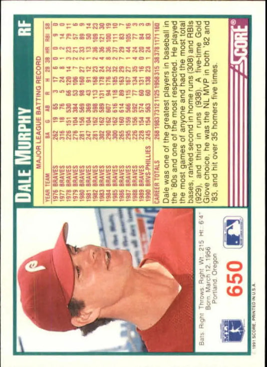 1991 Score #650 Dale Murphy NM-MT Philadelphia Phillies Baseball Card
