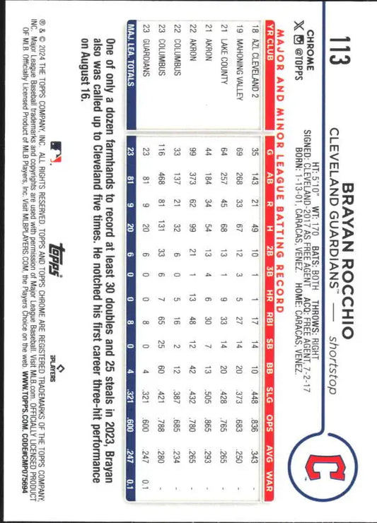 2024 Topps Chrome #113 Brayan Rocchio NM-MT Cleveland Guardians Baseball Card