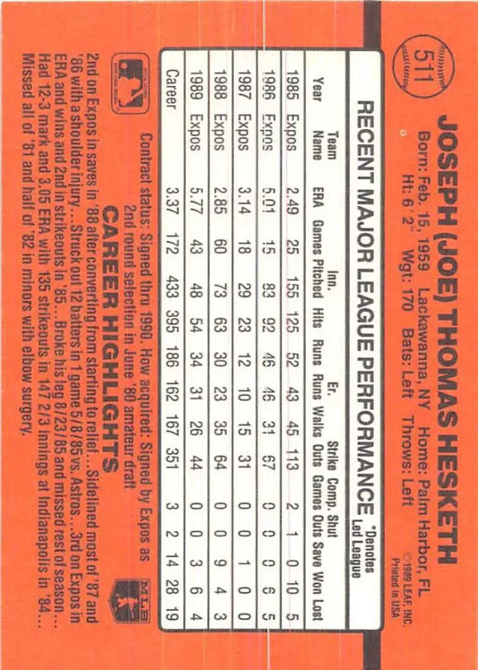 1990 Donruss #511 Joe Hesketh VG-EX Montreal Expos Baseball Card