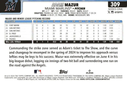 2025 Topps #309 Adam Mazur NM-MT RC Rookie Miami Marlins Baseball Card