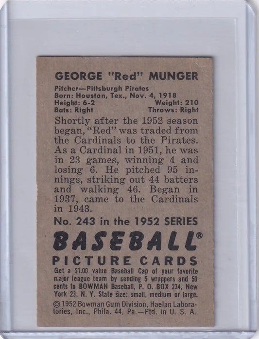 1952 Bowman Baseball #243 Red Munger UER - Pittsburgh Pirates