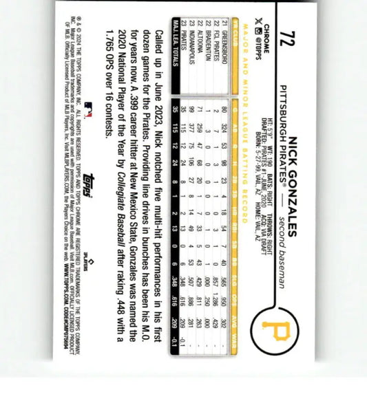 2024 Topps Chrome X-Fractor #72 Nick Gonzales NM-MT RC Rookie Pittsburgh Pirates Baseball Card