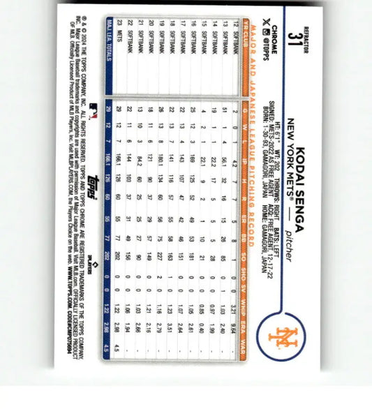 2024 Topps Chrome Refractor #31 Kodai Senga NM-MT New York Mets Baseball Card