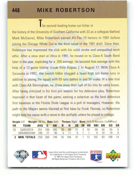 1993 Upper Deck #448 Mike Robertson TP VG Chicago White Sox Baseball Card