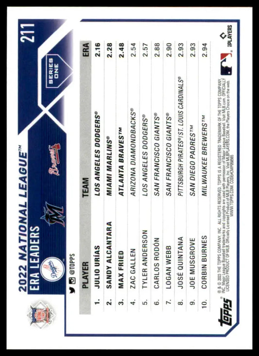 NL ERA Leaders (Julio Urías / Sandy Alcantara / Max Fried) LL 2023 Topps #211