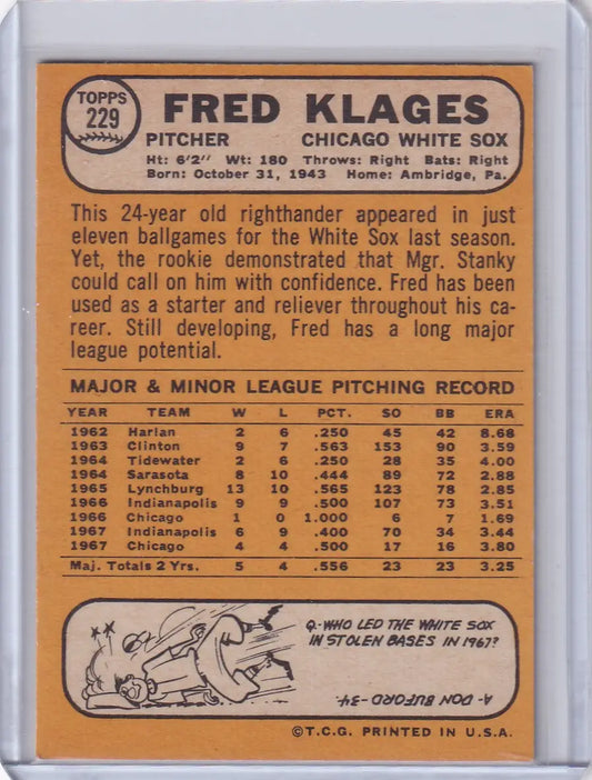1968 Topps Baseball #229 Fred Klages - Chicago White Sox