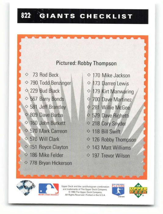 1993 Upper Deck #822 Robby Thompson TC VG San Francisco Giants Baseball Card