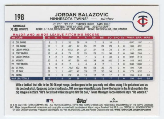 2024 Topps Chrome #198 Jordan Balazovic NM-MT RC Rookie Minnesota Twins Baseball Card