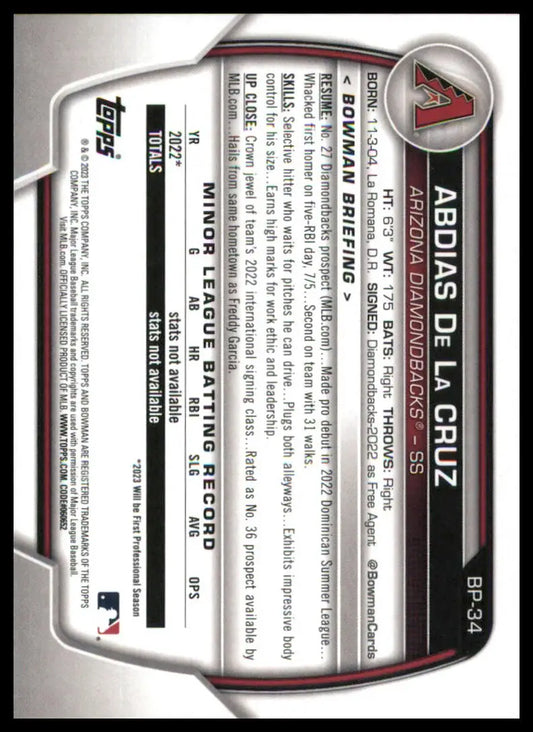 Abdias De La Cruz 2023 Bowman Prospects #BP-34 Arizona Diamondbacks