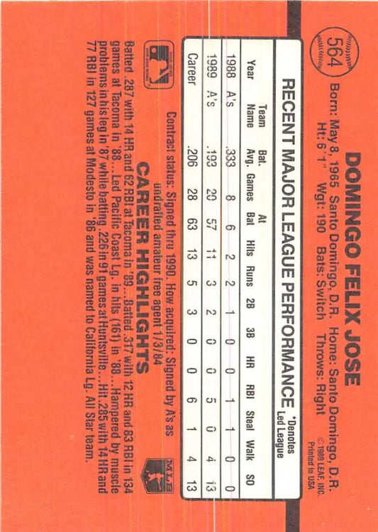 1990 Donruss #564 Felix Jose VG-EX Oakland Athletics Baseball Card