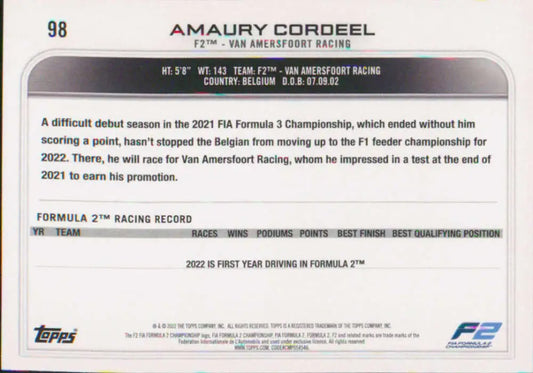 2022 Topps Formula 1 #98 Amaury Cordeel NM-MT Racing Card