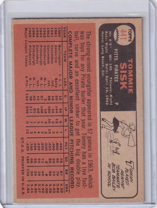 1966 Topps Baseball #441 Tommie Sisk - Pittsburgh Pirates