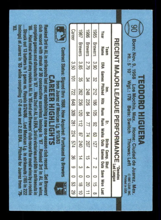 1988 Donruss #90 Teddy Higuera EX Milwaukee Brewers Baseball Card