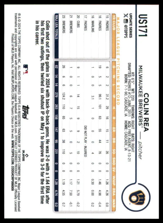 Colin Rea 2024 Topps Update #US171 Milwaukee Brewers