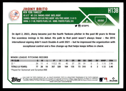 2023 Topps Holiday #H138 Jhony Brito NM-MT RC Rookie New York Yankees Baseball Card