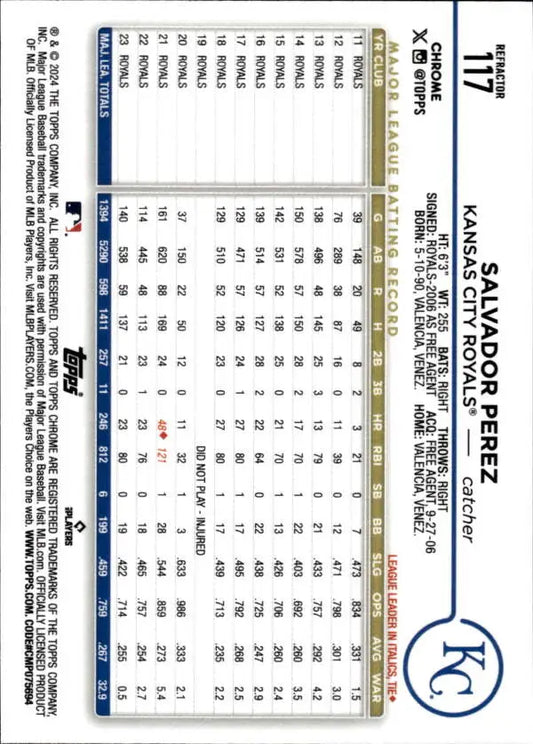 2024 Topps Chrome Refractor #117 Salvador Perez NM-MT Kansas City Royals Baseball Card