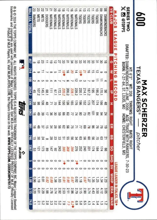 2024 Topps #600 Max Scherzer NM-MT Texas Rangers Baseball Card