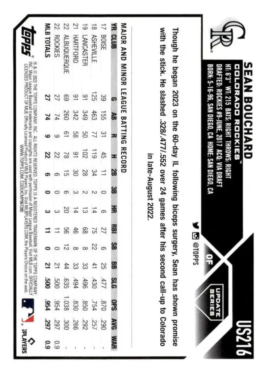 2023 Topps Update Series #US216 Sean Bouchard NM-MT RC Rookie Colorado Rockies Baseball Card