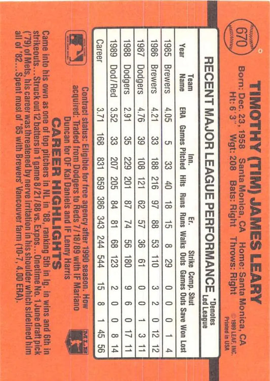 1990 Donruss #670 Tim Leary VG-EX Cincinnati Reds Baseball Card