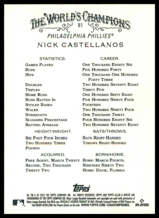 Nick Castellanos 2022 Topps Allen & Ginter #81 Philadelphia Phillies