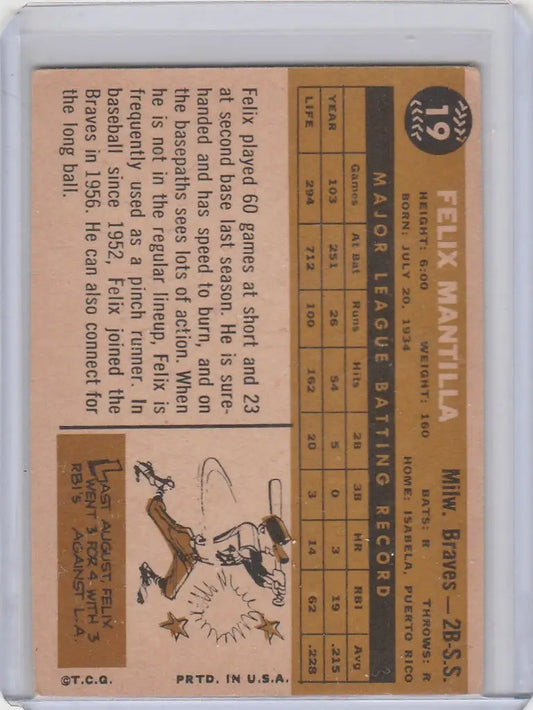 1960 Topps #19 Felix Mantilla Milwaukee Braves EX
