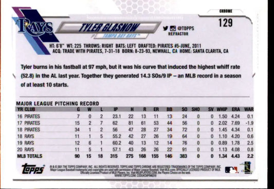 2021 Topps Chrome Refractor #129 Tyler Glasnow NM/MT Tampa Bay Rays Baseball Card