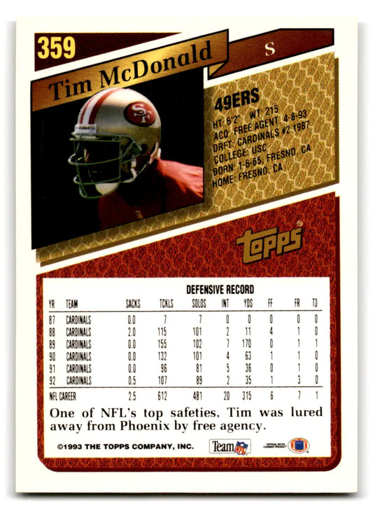 1993 Topps Football Tim McDonald #359 Gold 49ers