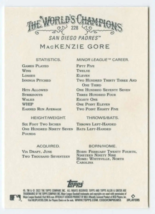 2022 Topps Allen and Ginter #228 MacKenzie Gore NM-MT RC Rookie San Diego Padres Baseball Card