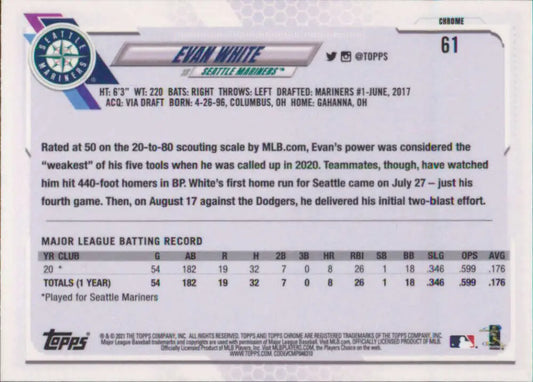 2021 Topps Chrome #61 Evan White NM-MT RC Rookie Seattle Mariners Baseball Card