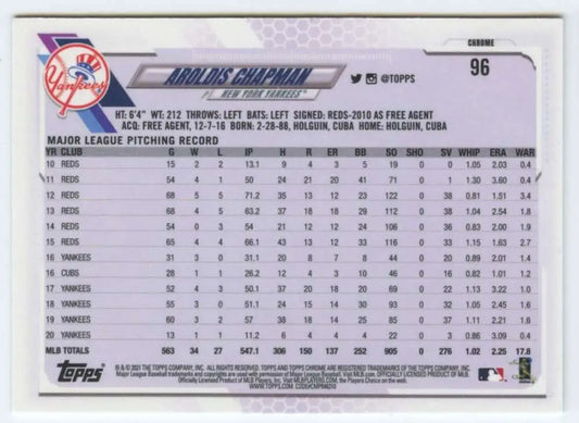 2021 Topps Chrome #96 Aroldis Chapman NM-MT New York Yankees Baseball Card