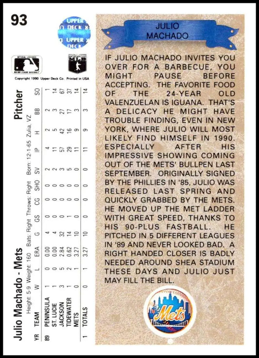 1990 Upper Deck #93 Julio Machado NM-MT RC Rookie New York Mets Baseball Card
