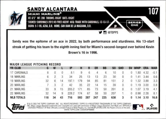 2023 Topps #107 Sandy Alcantara NM-MT Miami Marlins Baseball Card