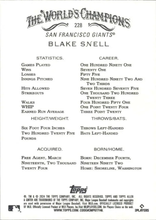 2024 Allen & Ginter #228 Blake Snell NM-MT San Francisco Giants Baseball Card