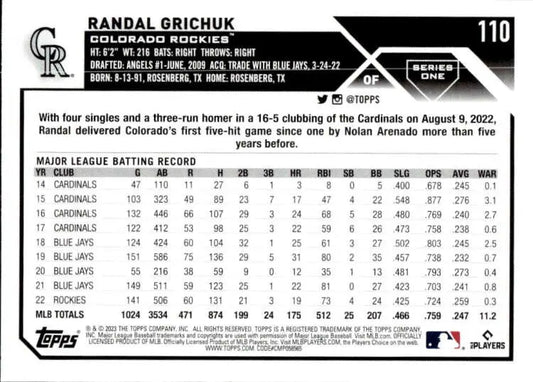 2023 Topps #110 Randal Grichuk NM-MT Colorado Rockies Baseball Card