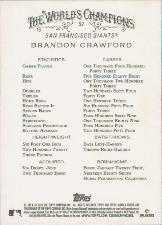 2022 Topps Allen and Ginter #52 Brandon Crawford NM-MT San Francisco Giants Baseball Card
