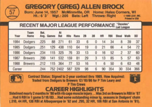 1989 Donruss #57 Greg Brock NM-MT Milwaukee Brewers Baseball Card