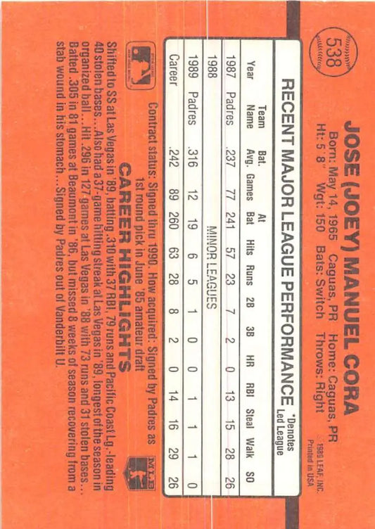 1990 Donruss #538 Joey Cora VG-EX San Diego Padres Baseball Card