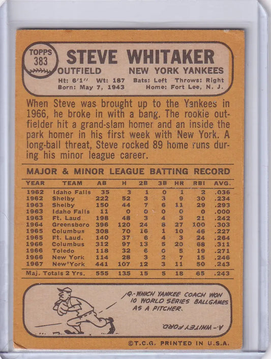 1968 Topps Baseball #383 Steve Whitaker - New York Yankees