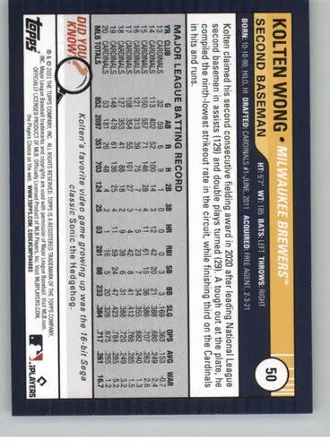 2021 Topps Big League #50 Kolten Wong NM-MT Brewers ID:42539