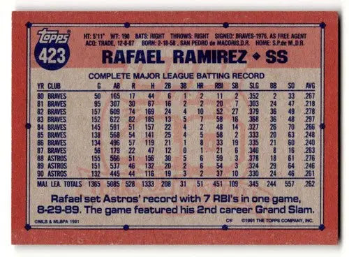 1991 Topps #423 Rafael Ramirez Houston Astros Baseball Cards EX/NM ID:54884