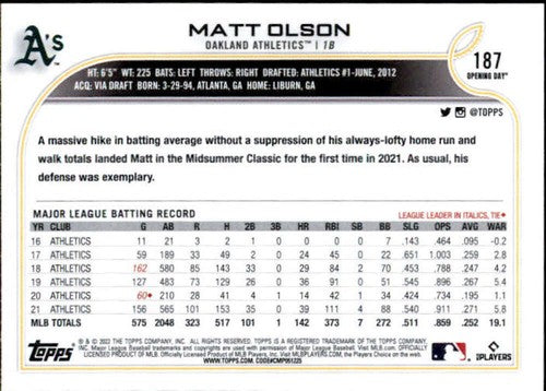 2022 Topps Opening Day #187 Matt Olson NM-MT Athletics ID:40459